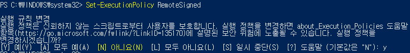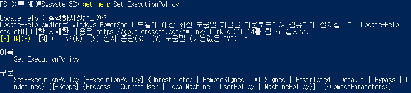 그리고 get-help Set-ExcutionPolicy를 입력하여 어떤 권한을 설정할 수 있는지 확인할 수 있다.