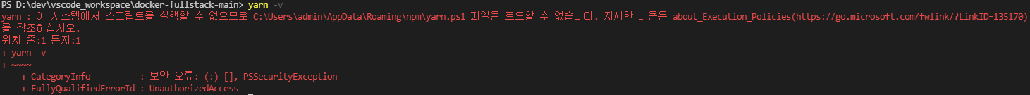 yarn을 주로 쓰진 않았지만 주로 쓰는 듯하여 나도 설치를 해서 진행해보려고 했는데 아래와 같은 에러가 떳다.